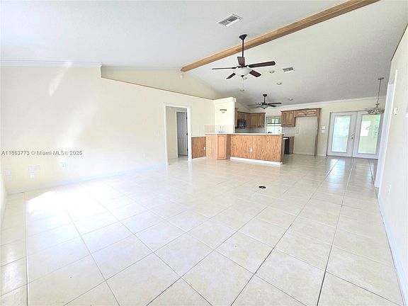 Welcome to this spacious 3-bedroom, 3-bath home in the desirable Erin Parks Canals neighborhood! Featuring an open floor plan with vaulted ceilings, a breakfast bar kitchen, and a split-bedroom layout for privacy. The primary suite offers a private bath, and the 550+ sq ft Florida room includes a wet bar—great for entertaining. Enjoy canal views from the backyard, with a rear garage door and ramp access for boats or jet skis. The 3-car pass-through garage spans over 1,400 sq ft and includes a full bath, perfect for storage or a workshop. New roof installed July 2025. Florida living at its best!