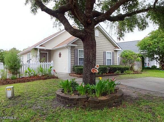 Move in ready 3BR/2BA home in Old Cape Code at Tidewater Plantation. This home has been upgraded with new LVP flooring in the main living areas and bedrooms, fresh paint and new shower surrounds. Features to the home include a spacious living room, separate dining area with brand new sliders to the side patio and an updated kitchen with new cabinets, stove, microwave, dishwasher and counter tops. The split bedroom plan includes the master bedroom at the front of the house complete with a private bathroom and nice size closet and the second and third bedroom at the rear of the house. Most rooms of the home have crown moldings. After a day at work relax on your covered side patio or hang out in on the covered front porch of your large detached shed that would be perfect for a man cave, workshop or craft room. The yard has a variety of trees and plants for the gardener in the family. This home faces a natural area so there is more privacy at this location. This home is located just minutes from Carolina Beach, area beaches and boat launches, shopping and more.