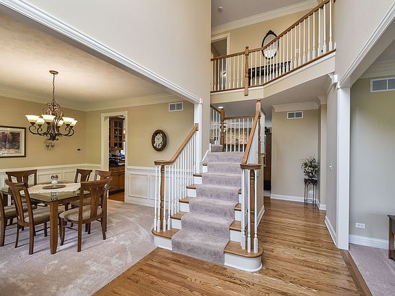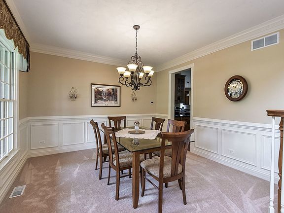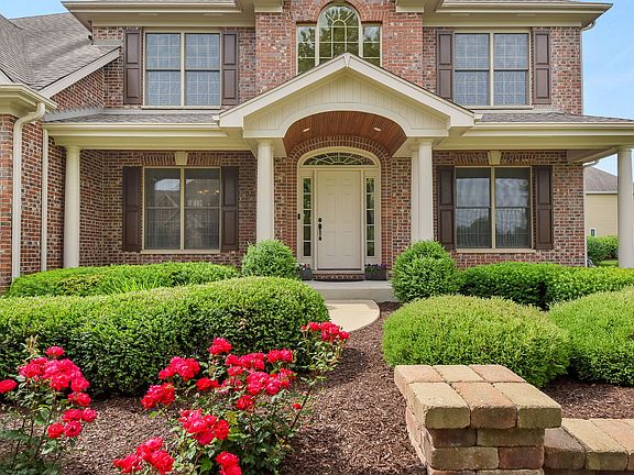This custom-built home is a masterpiece of design and craftsmanship, offering a perfect blend of elegance and functionality. Exquisite custom trim work is featured throughout the home including triple crown molding and wainscoting adding a touch of sophistication to every room. The large front porch invites you to relax and enjoy the peaceful neighborhood. The you will step inside to discover the expansive main floor with 9-foot ceilings, creating an open and airy ambiance. The heart of the home is the huge kitchen, featuring two islands with seating for four and an additional eating area and opens right up to the family room with a stunning stone fireplace; an entertainers dream! There is a main floor office/bedroom with beautiful views of the backyard through a bay window, a half bath, and huge mudroom/laundry! Head upstairs to the 5 bedrooms and 4 full bathrooms! The master suite features vaulted ceilings, a large private bath, and spacious walk in closet. The four other bedrooms have ensuite bathrooms and walk in closets as well! Let your imagination run wild in the full unfinished deep pour basement! Already equipped with plumbing and a great layout, make it what you envision! Whether it's a home theater, a fitness center, or additional living space. Every detail of this immaculate home has been thoughtfully considered, ensuring a pristine and inviting home. From the spacious interiors to the meticulously crafted finishes, this residence is a true testament to quality and style. This is a one of a kind floorplan in Sunset Prairie. The subdivision is located across from Peck Farm with walking/biking trails and activities. It is PRISTINE!!