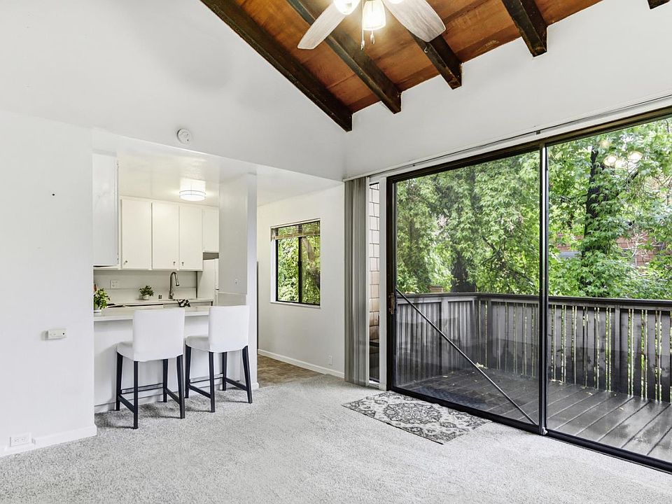 Private balconyMature treesBreakfast barBright open living spaceVaulted wood-beam ceilingsScraped ceilings