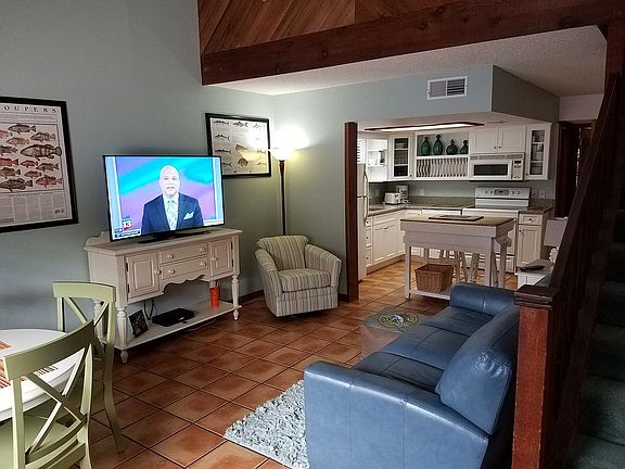 The floorplan consists of two bedrooms and two full bathrooms with ensuite bath and jacuzzi tub off the upstairs master, an alcove home office area and balcony overlooking tropical landscaping. Both bedrooms and living room have hook ups for Cable TV and High Speed internet Wifi. The kitchen is newly redone with quartz countertops, and solid wood white cabinetry. Tile floors flow thru the entire downstairs, newer carpet upstairs. All appliances along with new Maytag large capacity washer and dryer convey. New Coastal Central AC and Heat in 2017.