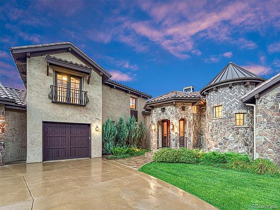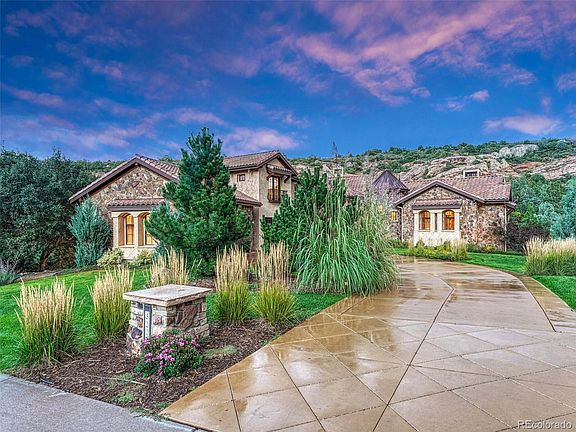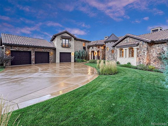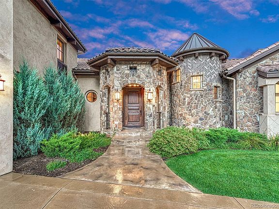 Owner Carry Financing Available! Breathtaking luxury 5br/5.5ba estate on .68 acres in the exclusive Ravenna community in Littleton. Nestled amongst red rocks and a premier golf course, this custom home is minutes to the Platte Canyon Reservoir and the Waterton Canyon and Highline Canal Origin trailheads. Stone, rich wood accents, solid wood doors, dramatic granite, warm fireplaces, soaring ceilings and a turret combine to complement the natural landscape and beautiful panoramic views. The wood-wrapped windows have been carefully placed to offer views from every window. A covered patio with a gas fireplace, infrared ceiling heaters and a built-in grill add to the enjoyment of this property and allows each season to be enjoyed indoors and out. The main floor master suite is spacious and includes an attached bathroom with an enclosed tile shower, dual sink vanity, 2 large closets with hanging and shelving, and a laundry room nearby. The office on the main floor has beautiful box beams and is located off the front foyer and staircase with wrought iron detail. A unique half bath located in the turret is impressive. Guests will love the incredible views as they stand on the Juliette balcony in the upstairs suite with an attached bathroom.  The walkout basement was designed for entertaining with a second bar, wine cave, TV and game area, fireplace and an additional 2-bedroom suite. An additional hobby/gardening room can be a second laundry room and has outside access. An exercise room and dry sauna add to the comfort and use of this one-of-a-kind luxury estate. With the Club at Ravenna offering dining, golf, swimming, fitness and social activities staying active and connected is easy. Ski resorts are less than 90 minutes away and water activities are within hiking distance or a short drive on C470. Enjoy a Colorado resort lifestyle nestled amongst this unforgettable natural setting within the secured Ravenna community while having access to the Denver area conveniences.
