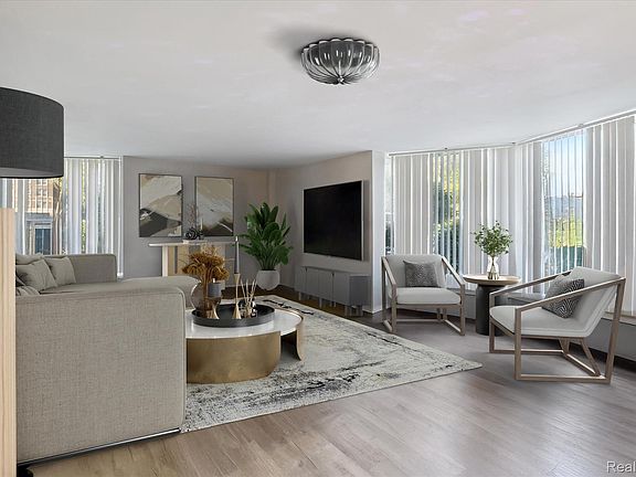 Step into a lifestyle, not just a home. This completely renovated, beautifully maintained 2-bed, 2 bath high-rise condo sits right on the Detroit River blending convenience and breathtaking views. Located on the first floor, this unit welcomes you with a spacious living room highlighted by a gorgeous bay window that floods the space with natural light. The open flow into the dining room and kitchen makes it perfect for both quiet evenings and entertaining guests. High ceilings throughout elevate the feeling of space and sophistication.