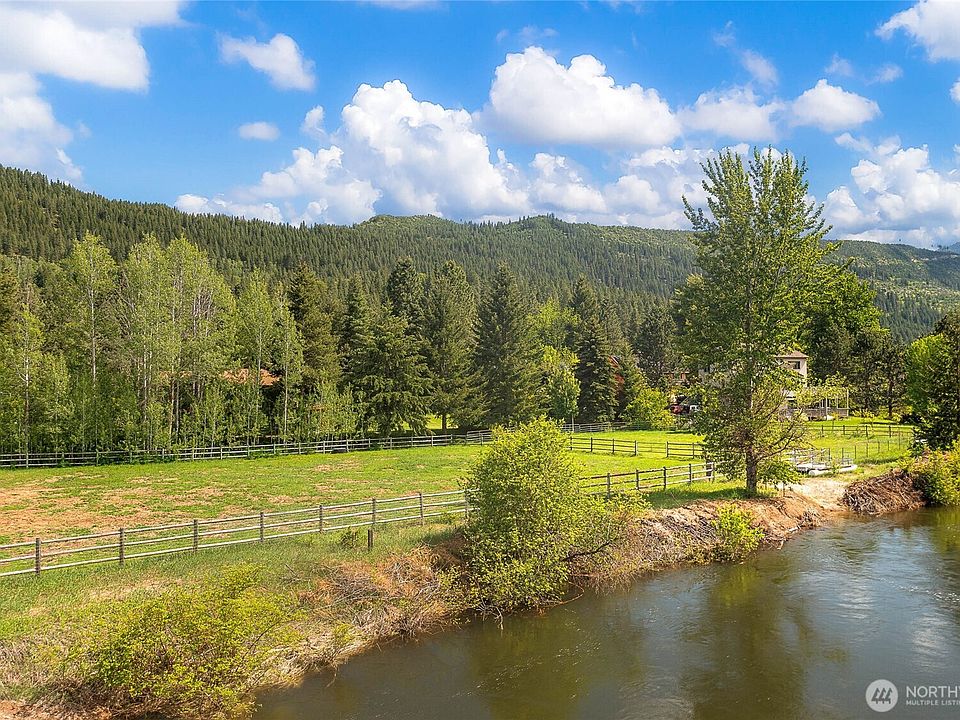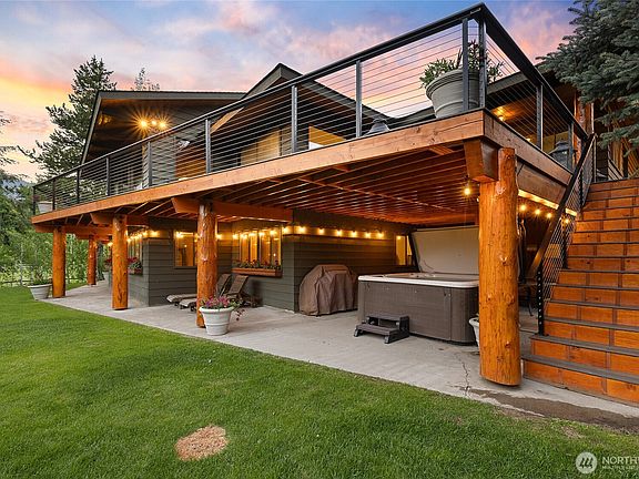 Appx. 300' of Icicle Riverfront sitting privately with the best fishing hole on 3.8 acres w/4488 sf 2 story view home. Fully fenced for horses/livestock, equine property, gated & irrigated with Tier I rental. Expansive living room ~ Rock wood burning fireplace, large bedrooms, side office, Large kitchen, island, & tons of storage with amazing views on main floor for one level living. Second living downstairs w/2 bedrooms, fireplace, kitchen, separate entrance, large office w/blue pine cabinets & desk. There are 3 cross fenced & gated pastures, a beautiful barn w/tack room, paddocks & stalls, hen house & RV parking. Large new deck w/cable fence, hot tub, privacy, sunny pastures, private beachfront. See list of Amenities.