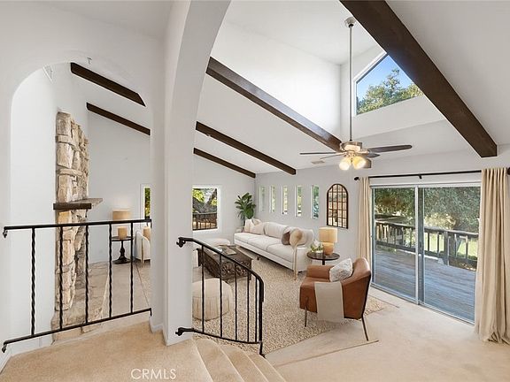 Inside, graceful arches frame the entry and great room, where soaring beamed ceilings, wrought-iron accents, and a striking stone fireplace create a warm and dramatic focal point. A large picture window overlooks the lush, oak-studded backyard, while three dormer windows and multiple sliders fill the space with natural light and invite seamless indoor-outdoor living.
