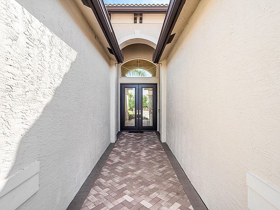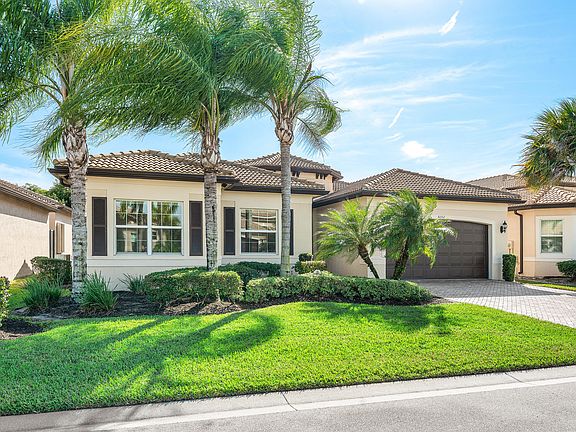 This beautifully appointed home (3/3+den) sits on a lushly landscaped private lot backing south. Great curb appeal with widened walkway and glass double door entry. Features include impact windows, 24'' rectified porcelain tile throughout, built-ins, custom closets, crown moldings & ceiling trim, designer light fixtures, fans and window treatments, LED hi-hats, solid core doors, upgraded baths and more! The gourmet kitchen has off-white wood glazed stacked cabinets, granite counters, glass tile backsplash, stainless steel appliances and all the bells & whistles! The kitchen is open to the living & family rooms. Luxurious primary suite. Two guest bedrooms-one ensuite. The den/4th bedroom has a built-in desk unit with storage & display. Great extended patio with large ''birdcage'' screen. This special home is located in Valencia Cove, a premier 55+ lifestyle community featuring a spectacular 39,000 square-foot clubhouse and 10 acre outdoor recreational facility. Endless activities and opportunities for fun abound - there are activities, trips, shows, and clubs of all types. The clubhouse features an expansive foyer and lobby, grand ballroom with raised stage and dance floor, four spacious card rooms, Cafe with indoor/outdoor seating, Arts and crafts room with kiln, Internet/Billiards room, Office, Catering kitchen with separate demonstration cooking studio, Yoga & exercise studio with ping pong, fully equipped fitness center and men's and women's locker rooms with steam rooms, massage room and showers. There are four pools - a beautiful Resort-style pool and Shade Pavilions, Lap pool with Swimmers' Lap Lanes, Resistance walking pool, Grandchildren's wading pool, and an Outdoor whirlpool spa. There are eight har-tru tennis courts with shade pavilions and lighting for night play, tennis pro shop, tennis pro, league play, six pickleball courts, pickleball pro, league play, 2 bocce courts, league play, half-court basketball and walking/jogging/biking paths throughout and just outside the community. Valencia Cove is conveniently located near shopping, restaurants, houses of worship and major highways!