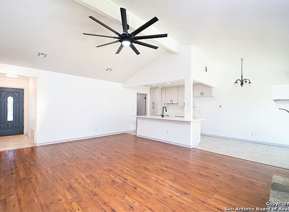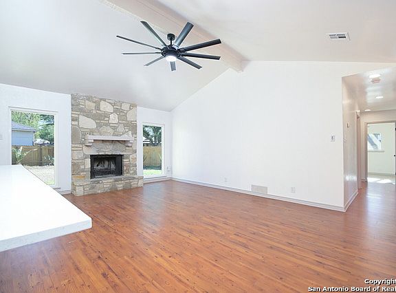 Beautiful one story, very nicely remodeled four bedroom home, clean & freshly painted interior and exterior in Sherwin Williams designer hue, three sided stone home on a fantastic 1/4 of an acre large lot, in a peaceful, quiet subdivision. The Pella front door welcomes you into a beautiful space, an amazing open kitchen frames the space brand new custom handcrafted wood kitchen cabinets, under cabinet lighting, quartz counter tops and island with sitting and a Stainless Steel sink, accentuated with a Moen lifetime warranty fixture. Brand new electric stove/range Newly installed Champions windows throughout house, beautiful new show windows frame each side of the stone fireplace, allowing a flow of natural light into the inviting and open main living area with high ceilings, the cedar wood post painted in white. Inviting outdoor access to the large back yard from dinning area sliding doors. Laminate wood floors in main living area and durable porcelain tile of faux wood, evoking a California light wood feel throughout the house. Master bath nicely remodeled with dual vanities and light fixtures, handcrafted cabinets and white quartz counters on both bathrooms, newly remodeled tile bathroom spaces with designer finish out, custom design stand up master shower, new Kohler toilets, Delta lifetime warranty bathroom faucets and fixtures in both bathrooms and brand new Delta vents and heater fans. The guest bathroom features a porcelain tub and custom tile design on the walls, exclusive Baldwin hardware and hinges on all doors, three inch new customized baseboard. LED recessed lighting and brand new switches and plate covers throughout the entire house and in the refinished ample garage with new Genie 1/2 HP garage opener. Brand new cedar fence and gate leading into the large back yard with customized LED flood lighting over patio slab. Lots of custom detail and charm! Things to do around the Neighborhood- direct access into Nani Falcone Park from the neighborhood, Disc Golf Course, walking and running trails at French Creek Trails. Playground, OP Schnabel Park across the street, close to Maverick Library, Alamo Golf Course. Close to shopping and restaurants.
