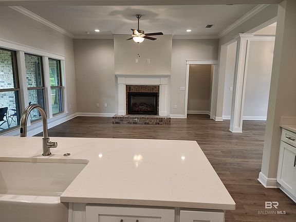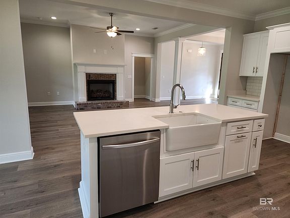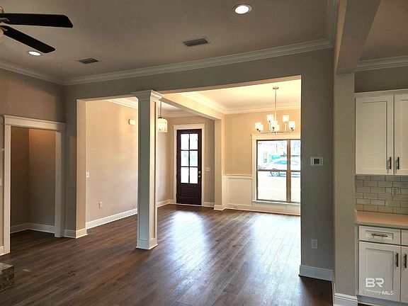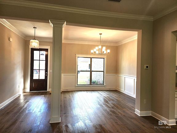 Your dream home is waiting for you at Primland! This peaceful community is situated just off County Road 12 near Graham Creek Nature Preserve and minutes from the beautiful Gulf Shores/Orange Beach beaches, exquisite restaurants, and fabulous entertainment! The beautiful Hummingbird plan sits on a big lot which backs up to the Weeks Bay Foundation wooded property and next to a common area pond. As you enter through the 8 ft. solid wood, stained front door, you'll see high 10 ft ceilings, a formal dining room with beautiful chandelier and wainscotting, and spacious living area. You will love the kitchen which includes a large island, painted cabinets, a stainless single basin sink, Samsung appliances, a gas cook top, wall oven with built-in microwave, and a fabulous pantry with wood shelving. The primary bedroom is enormous with an ensuite bathroom, which has a double vanity with framed mirrors, a magnificent walk-in tile shower and a huge walk-in closet with wood shelving. EVP flooring in main areas and primary bedroom, tile in laundry and baths, and carpet in secondary bedrooms only. This plan features a spacious 2 car, side entry garage and a smart home package to include the Ring doorbell, security camera and more! The home comes with a 1 one year termite bond, warranties, and is Gold Fortified, which may save you on homeowner's insurance. This is a TRULAND floor plan under construction with an approximate completion end of April/May 2024. NOTE: Main photo is a rendering of the Hummingbird plan, not of the actual home under construction.