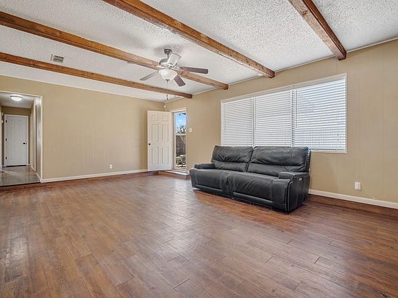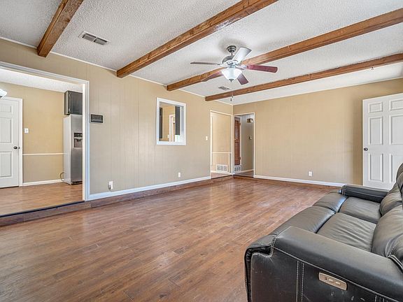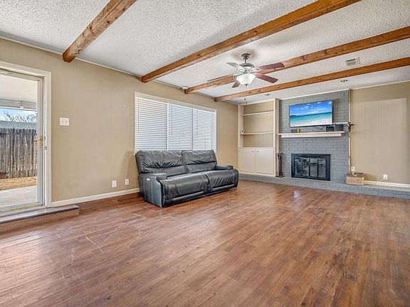 This home is located on a cul-de-sac. It has a large living room with a beamed ceiling and a fireplace.