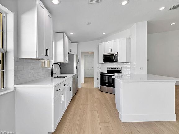 This stunning villa has been fully remodeled from top to bottom and is completely move-in ready. The interior has been entirely gutted and rebuilt with luxury plank vinyl flooring, fresh paint, new lighting throughout, ceiling fans, and custom closets for beautifully organized storage. A large family room with vaulted ceilings creates an open, airy gathering space. The den offers flexible use — ideal as a dining area, or a secondary family room. The brand-new kitchen features white shaker cabinetry, quartz countertops, stainless steel appliances, and a stylish subway tile backsplash. The laundry room offers new matching cabinetry and its own coordinating backsplash for a clean, cohesive look. Both bathrooms have been beautifully updated with designer tile, new vanities, new toilets, and all-new plumbing. Outside, a brand-new private pool overlooks a serene long lake view — the perfect setting for relaxing or entertaining. The home also offers excellent storm protection with electric shutters on the lanai and aluminum roll shutters on the rest of the home. Additional highlights include central vacuum, a newer A/C for added comfort and peace of mind and a new pool pump. Located within Verona Walk, an award-winning, guard-gated community known for its resort-style amenities — pools, tennis, pickleball, fitness center, restaurant, and more — all with low HOA fees and an active lifestyle. Dive into a vibrant social scene with a calendar full of activities and events. Additionally, conveniences are at your doorstep with a restaurant, ice cream shop, salon, travel agency, gas station, and post office all located within the community.