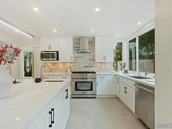 Experience luxurious living in this charming yet expansive custom remodeled two-story home. Boasting 4 bedrooms plus optional Den/ Bedroom, 3.5 baths and over 3,214 square feet, the home features a modern, bright, and airy kitchen with custom cabinets, stainless steel appliances, and a new walk-in pantry. The primary bedroom retreat offers a sitting area, an enormous ensuite bathroom, while a downstairs ensuite bedroom provides added convenience. Enjoy the private pool, spa, and lounge area in the low-maintenance yard, or take advantage of the community amenities. The stylish powder room, three-car garage, and low HOA fees add to the property's appeal. Nestled within the serene enclave of La Jolla Woods, this home offers an unparalleled living experience in one of Southern California's most coveted coastal communities. A hidden gem, known for its coastal breezes, tree-lined streets, and stunning views of the canyons and ocean. This prime location provides easy access to I-5, La Jolla Shores Beach, Torrey Pines Golf Course, and top-rated schools like Torrey Pines Elementary. Nearby, you'll find a variety of shopping and dining options, including Ralphs, Whole Foods, Trader Joe's, and the Westfield shopping plaza, as well as the vibrant UCSD campus and Scripps Medical facilities. Don't miss this rare opportunity to own a piece of La Jolla's tranquil paradise.
