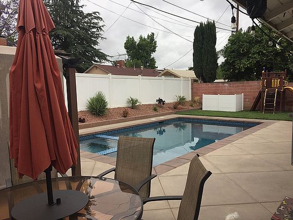 Buy a home on a charming tree-lined street in a great neighborhood. Entertain friends and family with a BBQ out in your backyard by the pool and spa. The home features a bright galley kitchen with granite counter-tops, new shaker cabinets and lots of space for preparing meals. After a hard day, curl up with a good book by the fireplace. The garage has been converted to a master bedroom with full bathroom and walk-in closet. A large open living room and dining area with lovely laminate floors with three sliding doors facing the gorgeous pool complete this beautiful home.