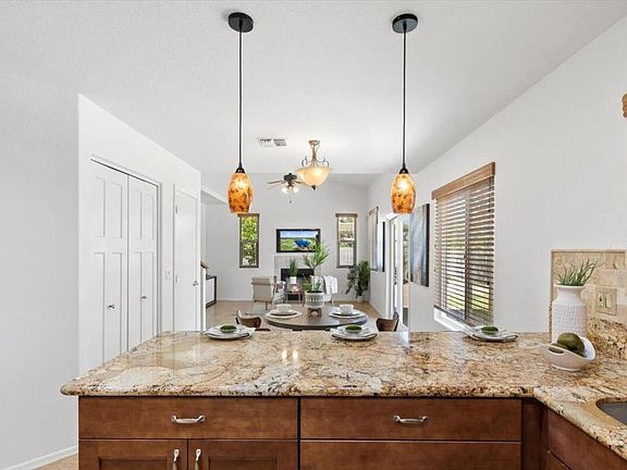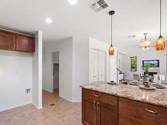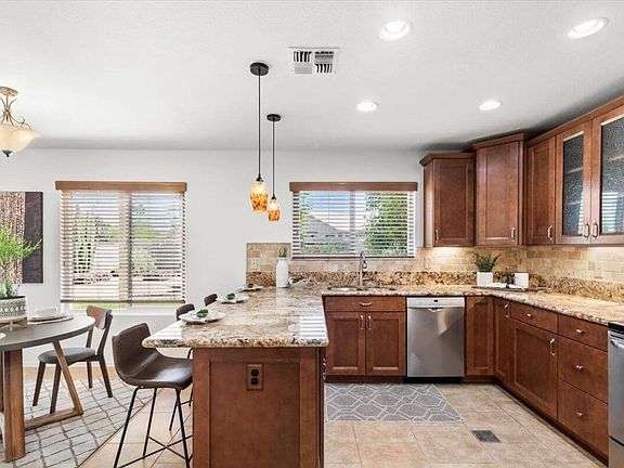 Prepare to be enamored by the tastefully remodeled spacious kitchen, a culinary haven boasting contemporary cabinets, granite countertops, and stainless steel appliances. Adorned with a travertine backsplash, it effortlessly combines style and functionality.