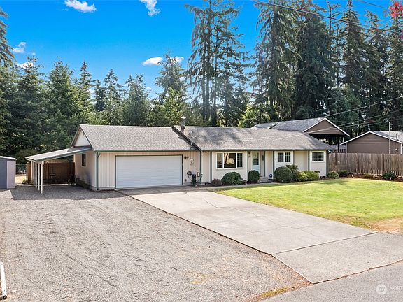 Welcome to this charming 3-bedroom, 2-bath rambler on just under 1/3 acre! The primary bedroom features an attached bath. Enjoy recent kitchen countertop updates, a cozy pellet stove for energy efficient heating. The property includes an attached garage, carport, and RV parking. The backyard offers a dog run, chicken coop, and two sheds (12x8 and 7x8). All appliances are included, making it move-in ready. Don’t miss out on this fantastic opportunity! Walk to Bonney Lake, Allan Yorke Park, schools, and the dog park. No HOA!