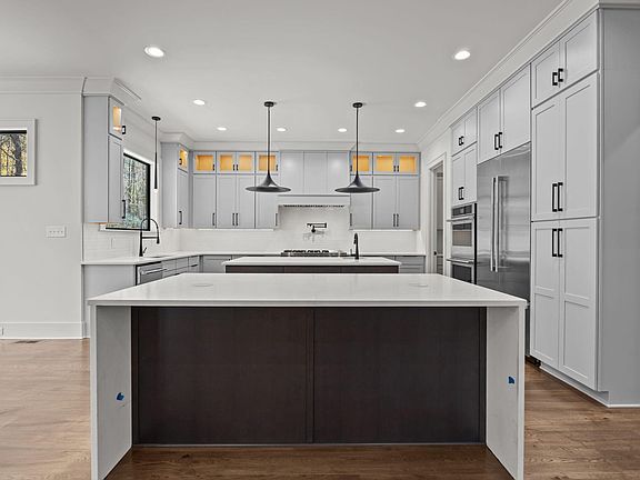 Custom built by award winning Brandywine Homes! 1.52 acre private wooded lot in a serene pond community. Upgraded trim and designer finishes throughout! Wide plank hardwoods span throughout the main living areas including the primary and guest suite! 3-car garage! Kitchen: offers custom ceiling-height cabinetry, double quartz islands with barstool seating perfect for entertaining, designer pendants, ornate tile backsplash, gourmet appliances and hidden walk-in pantry with french door! Spacious informal dining area with full window surround, flooded with natural light! Primary suite: features hardwoods, designer lighting and luxurious en-suite bath with custom duall vanity with quartz top, zero entry shower with tile to ceiling, freestanding tub and huge walk-in closet with built-ins! Family room: offers a vaulted ceiling, gas fireplace with flanking built-ins and glass sliders to the screened porch! Upstairs features a recreational room with built-in bar area and access to the study/gym, flex space and two additional en-suites!