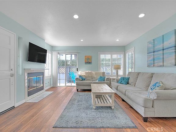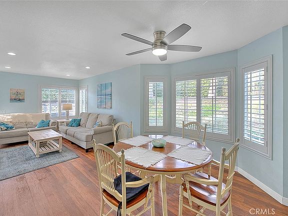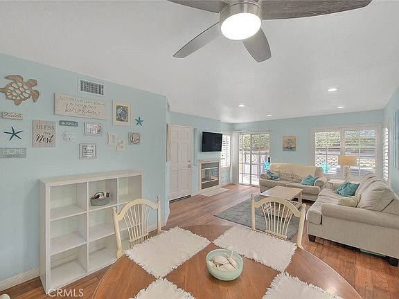 Step inside to find a cozy yet spacious living area, complete with laminate floors and shutters throughout. The open-concept layout features a sliding glass door that leads to a roomy front porch, perfect for enjoying Southern California's sunny days. The updated kitchen boasts marble countertops, stainless steel appliances, sleek shaker cabinets, and a walk-in pantry, making it ideal for both cooking and entertaining.