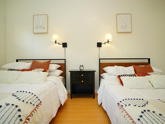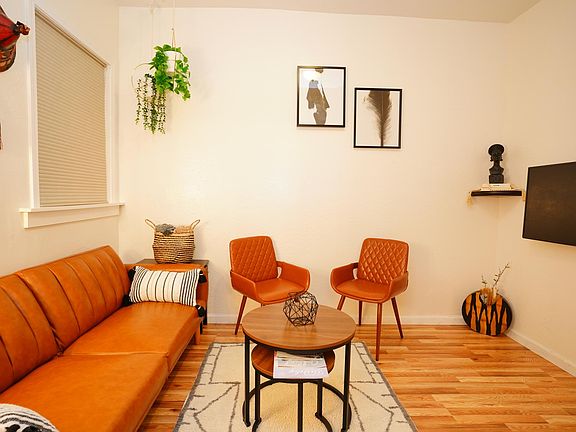 The professionally landscaped backyard provides a tranquil space with hammock, fire pit, and BBQ, perfect for therapy sessions, group gatherings, or peaceful reflection. Bedrooms offer premium bedding and abundant natural light, while the open plan living area is set up for both work and relaxation. The property is located in a quiet neighborhood with effortless street parking and direct access to Old Town, Jack London Square, convention centers, and quick routes to San Francisco, Berkeley, and Alameda.