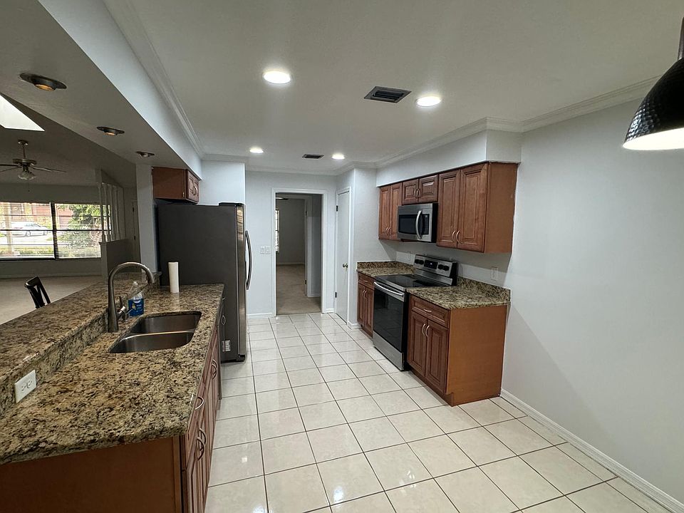 Large rooms and private fenced yard. House has 3 bedrooms plus an office/study/den and a 500 sq ft Florida room. Air conditioned Florida room makes a great game room and play area. Florida room also has a sink and storage cabinets. Living/Great Room has a wood burning fireplace and can be used as a Living/Dining Room combo. Kitchen recently remodeled with granite counter top and new Samsung appliances. Modern master bath with separate tub and shower. Entrances to the Florida Turnpike, SR 408 and SR 429 all within 4 miles. Lawn care included!
