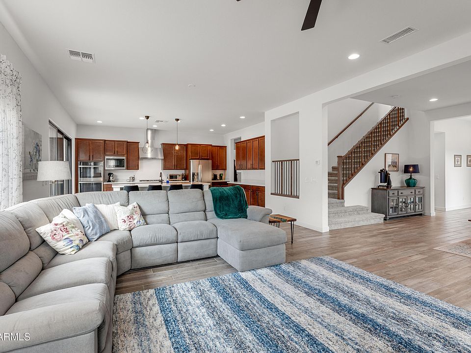 Discover this stunning residence with OWNED SOLAR in the prestigious gated TriPointe Avance Community. Nearly new and freshly updated with new carpeting, this 4 bedroom, 3.5 bath home offers style, comfort, and function. Upstairs, enjoy an expansive loft and a spacious primary suite with separate room for a home office, sitting area, or study. The main floor showcases a versatile guest suite, perfect for visitors or multigenerational living, plus an open great room and chef's kitchen with quartz countertops, double oven, gas range, and ample storage. Step outside to a side patio and a low maintenance backyard with turf and breathtaking mountain and city views. Additional highlights include access to Avance's resort-style pool, fitness center, many community activities and walking trails.