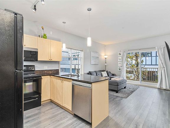 Corner unit in the heart of Langford! This bright and beautifully updated 2-bed/2-bath condo features brand new flooring, new in-suite laundry, fresh designer paint, and a stunning new fireplace. Built in 2006, the home offers sleek black granite countertops and an open-concept kitchen with a sit-up breakfast bar, complemented by 9 ft ceilings and excellent bedroom separation for added privacy. The spacious primary bedroom includes a full 4-piece ensuite with a soaker tub, while the second bedroom is served by a 3-piece bathroom. Enjoy the covered southwest-facing deck—perfect for afternoon sun—and the convenience of being just steps from Goldstream Village, bus routes, shopping, restaurants, and parks. Set in a well-maintained building with a small, close-knit strata and no size restrictions for dogs, this property offers comfort, community, and flexibility. Move-in ready and filled with natural light, this corner unit is a must-see!