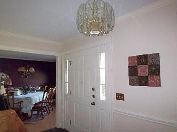 No city taxes 4 bedrooms 2.5 baths 2225 Square Feet Built in 1988 Vinyl exterior Located on .77 acres Double attached garage with storage Foyer with slate flooring Great room with masonry gas log fireplace Formal dining with laminate flooring, picture window, chair rail and crown molding Powder room updated with tile flooring and granite vanity 2007-- updated kitchen offering tile backsplash, work island, tile flooring, pantry, built-in microwave, dishwasher, smooth top range, breakfast nook with bay window Large master suite with built-in desk, walk-in closet, ceiling fan, whirlpool tub, separate shower, double vanity, ceramic tile flooring, shutters at window and linen closet Three other bedrooms Hall bath with vanity and tub/shower combination Screened porch with skylight and ceiling fan Huge deck with eight-person hot tub I nvisible underground fence Wooden fence encloses backyard Separate fenced-in area Extensive professionally landscaped yard Security System (ADT) and surveillance camera system with 2 week back-up Two-- 2 ton16 seer heat pumps and central A/C—new in 2007 2001—roof replaced Storage building 9 zoned sprinkler system