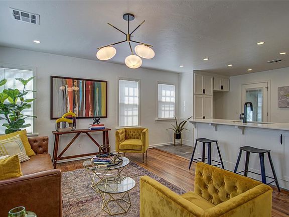 Discover urban living at its finest in this darling bungalow nestled just blocks away from the vibrant Western Ave District in the heart of OKC's urban core. Offering the perfect blend of convenience and charm, this home is mere minutes from a plethora of shopping, dining, and entertainment options. Step inside to find a beautifully remodeled open kitchen and living room, ideal for hosting gatherings or relaxing at home. The kitchen is a chef's delight, featuring custom cabinets, elegant quartz countertops, a pantry with convenient pull-out drawers, stainless steel appliances, and a stylish designer tile backsplash. Enjoy the abundance of natural light that floods the living room through its numerous windows, creating a warm and inviting atmosphere that seamlessly connects to the heart of the home. The super cool modern West Elm light fixture and can lights also add to the ambience in the living room. Oak hardwood floors grace the majority of the house, complemented by tiled floors in the kitchen and bathroom. The hall bathroom is a complete remodel with a custom vanity, luxurious marble floors, and a stunning walk-in shower with meticulously crafted tilework. The thoughtful redesign extends to both bedrooms, where reorganized closets maximize storage and convenience, accompanied by ceiling fans with convenient remotes. The laundry room is off the kitchen and leads to the backyard. Outside, the backyard beckons with an open patio and two separately fenced areas, offering versatility for outdoor entertaining or peaceful relaxation. A spacious storage building in the back portion of the fenced yard adds functionality and convenience to this delightful property. Don't miss the opportunity to make this urban oasis your own, combining the best of modern living with the character of a classic bungalow.