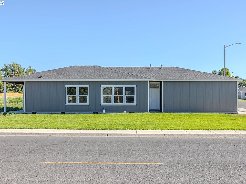 Welcome home to this brand new construction, 3 bedroom, 2 bath home in the heart of Hermiston on a corner lot! This home sits on a large corner lot with front sod and sprinklers already put in for your convenience. Enjoy the three car garage to store your vehicles, toys, use as a workshop, or storage! Inside you’ll find a spacious living room and kitchen with an open concept designthat brings the whole posse together. The kitchen features a large island for meal prep, and includes the dishwasher, stove and microwave. Experience the easy cleanup with beautifulwood-looking vinyl flooring throughout the open concept main living spaces, and cozy carpet in all the bedrooms for comfort. Enjoy your backyard covered patio for slow evenings and beautiful sunsets. This home is ready to move in, don’t miss your chance and schedule your showing with your favorite realtor today!