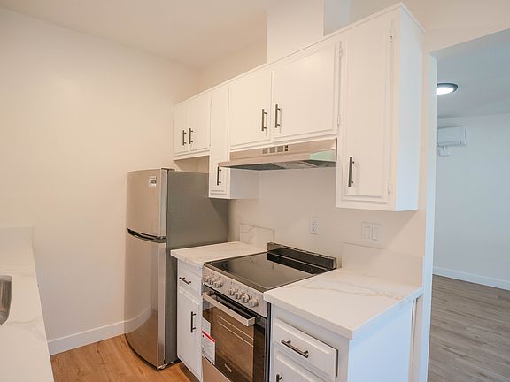 This 1 bedroom / 1 bathroom apartment has been fully remodeled from top to bottom; The living room features new flooring, updated lighting, within a bright, open layout that creates a warm and inviting atmosphere. The kitchen stands out with an all-new stainless steel refrigerator and electric range, and is paired with new countertops and modern finishes that give the home a polished look. The bathroom has been completely updated with new tile work, vanity, and fixtures, bringing a clean and contemporary feel throughout. The unit is all-electric and equipped with air conditioning for year-round comfort. There is also a convenient community laundry room on-site for residents.