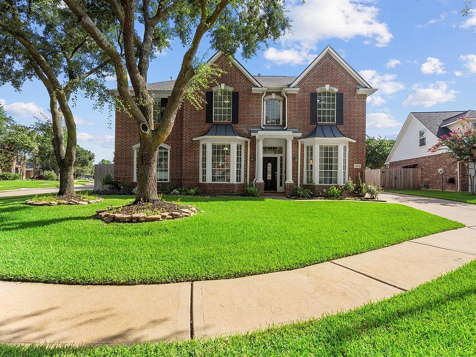 This stately two-story brick home is nestled on a beautifull lot with mature trees and lush green grass, offering exceptional curb appeal. Step inside to a grand foyer flanked by a formal dining room and a private home office. The spacious living room features a cozy fireplace and large windows that bathe the space in natural light. The open-concept kitchen boasts a center island, stainless steel appliances, pantry, and a sunny breakfast nook with backyard access. The primary suite is a peaceful retreat with crown molding, large windows, and a luxurious ensuite bath featuring a jetted tub, glass-enclosed shower, dual sinks, and a walk-in closet. Upstairs offers generously sized secondary bedrooms, bathrooms, and a versatile game room, currently being used as a 6th bedroom. . The backyard is your private oasis—complete with a sparkling pool with fountains, a relaxing hot tub, and an air-conditioned pool room perfect for year-round enjoyment.