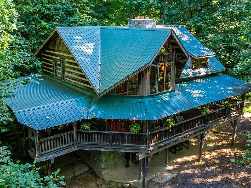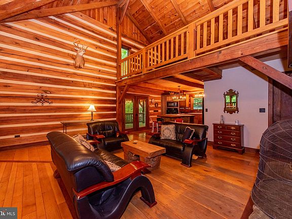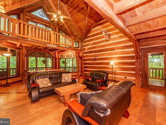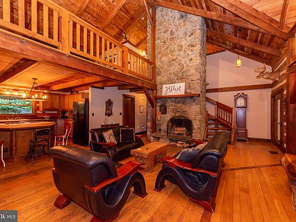 Tucked away on a private near 40 acre lot, this amazing timber frame log cabin was hand built with love and skilled craftsmanship! An artisan home, The builder sawed all of the material for the home~, including Red Oak, White Oak, and Ash hardwood floors with Walnut trim indoors and out! First impressions from covered wraparound porch that spans the length of the home amongst gorgeous natural stone patios, sourced on site!! Enter to find an open 2 story great room boasting poplar log walls and a stone wood fireplace with Dutch oven insert off open dining area with panoramic windows and charming kitchen with curly sassafras wood cabinets and center island with walnut countertops!~ ~Soaring white pine ceilings~ are just an amazing sight and add cozy vibes throughout the home! Dancing white oak stairwell to upper level with loft seating area, ladder loft area, and owner's suite with beamed cathedral ceilings, walk in closet, and attached bath with separate shower and claw foot soaking tub! 50 year metal roof, captured mountain spring, stocked pond, hiking and horse trails to Gambrill State Park, Four wheeling trails, and so much more!! Welcome Home!