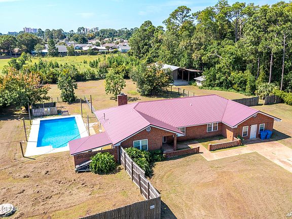 Looking for a RARE opportunity to own acreage on Panama City Beach? Well, come on and bring your horses! This ranch style home sits on 2.88 acres of fenced-in land with a large pole barn that includes an air-conditioned office area. This property is conveniently located between Saint Andrews Bay and the Gulf of Mexico, Near Thomas Drive and the Navy base. This home is being sold Fully Furnished with an acceptable offer! Recent upgrades to the home include a new metal roof in 2023, all new gravel driveway, granite countertops, & new appliances. This home offers a wide entry way into the open living room with a wood burning fireplace and sliding glass doors to the backyard. The master bedroom has beamed cathedral ceilings, a walk-in closet and en suite bathroom with jetted tub. There are an additional three bedrooms spaced out through the home with an additional full bathroom and a half bath. A converted air conditioned garage is perfect for a large home office, workout room, or hobby room. It is currently setup as an awesome game room equipped with a TV, pool table, & air hockey table. Outside is an in-ground saltwater pool with a new liner, covered patio, and barn. The barn includes 576 sqft enclosed with a loft for storage, a garage door, and air conditioned office. There is an additional 1344 sqft of covered storage. The home is not in a flood zone and completely fenced to provide privacy and seclusion. The opportunity to own a ranch style home, with a workshop, and almost 3 acres of land on the beach doesn't come available very often. This is currently the ONLY property of its kind available on Laird St. So, don't wait and schedule a showing today!