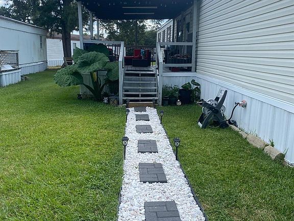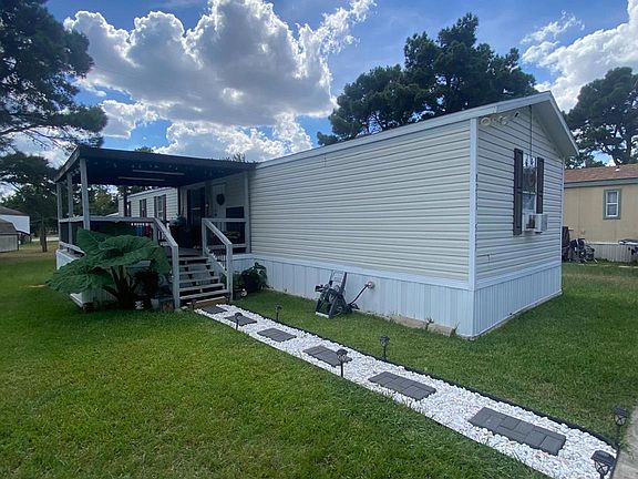 This is a nice and well mainteined home. Vinil floors, has a carpet rug but vinyl floors thru out. Beautiful home. Quite subdivision. So many shopping options and restaurants in walking distance. Land rental includes water and trash. Has a community Pool. No HOA.