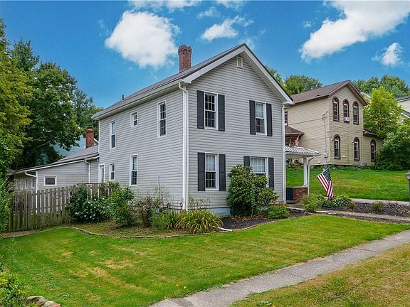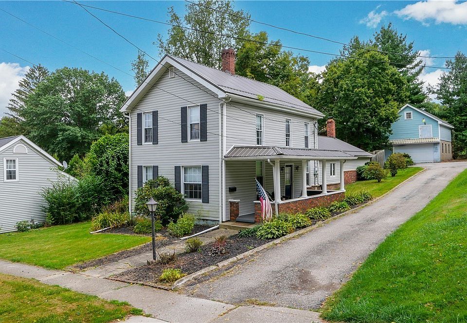 Welcome to this beautifully updated home in the heart of downtown Garrettsville, just minutes from shops, dining, and local amenities. Relax and enjoy the inviting front porch—perfect for rocking chairs and morning coffee. Inside, the first floor offers convenience with a spacious bedroom, laundry area, and a large mudroom leading out to the fully fenced backyard with a generous concrete patio. The stunning kitchen is a showstopper, featuring stylish cabinetry, double ovens, subway tile backsplash, and stainless steel appliances, all overlooking the formal dining space. Step up into the expansive living room, highlighted by a cozy wood-burning fireplace, ideal for gatherings. Upstairs you’ll find three large bedrooms and a full bathroom, providing plenty of space for family or guests. Additional features include a detached garage with extra storage, a durable metal roof replaced just 4 years ago, and fresh paint and flooring throughout. This move-in-ready home combines character, comfort, and modern updates—all in a prime location!