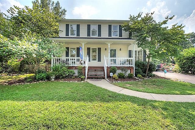 Awesome, two story Colonial home in Deer Run, offering 3 bedrooms, 2.5 bathrooms, with a full front country porch with a 2-CAR DETACHED GARAGE! Large eat-in Kitchen with STAINLESS STEEL appliances, bull-nose edged countertops, back splash, and white wood cabinets. Walk in laundry room. Newer paint colors throughout. Newer flooring. Updated fixtures. Newer carpet upstairs! Ceiling fans in most of the bedrooms! Family room with gas fireplace, slate surround, tray ceiling with recessed and accent lighting! Large fenced in rear yard with lots of shade perfect for a dog. The home includes an over-sized detached 2-car garage with electricity, insulated walls and concrete floor. Double width paved driveway, and a newer roof (2015) with 30 year architectural dimensional shingles and ridge vent! Low maintenance vinyl siding. 50 gallon water heater (2010). Attached storage shed. Very convenient location! Close to 360 and 288! Nice .31 acre lot, with trees in the rear for privacy.