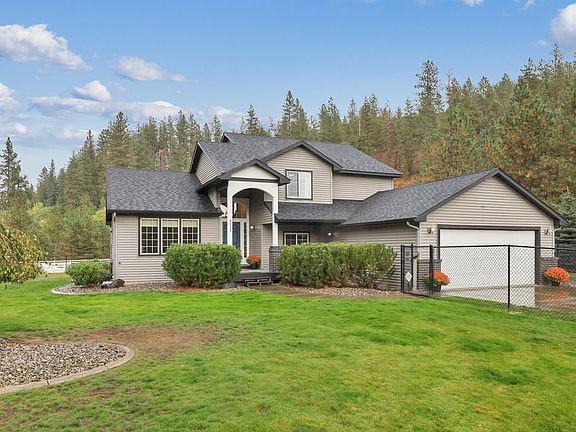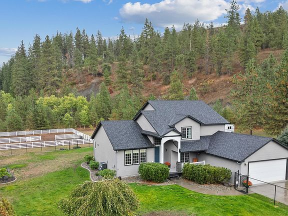 MOTIVATED SELLERS! NEW PRICE! Welcome to your dream country retreat for you and your horses! Nestled on a private 5+ acres, this meticulously maintained 4-bedroom home offers the perfect blend of space, comfort, and rural charm. Located just a short 13-minute drive from downtown Spokane, you'll experience the best of both worlds - serene countryside living with easy access to city amenities. The modern kitchen boasting stainless steel appliances has a great view of the back yard. The adjacent dining area opens up to the spacious family room with fireplace or onto the outdoor composite deck. The primary suite, with en-suite bathroom, soaking tub and walk in closet, has its own private deck. Enjoy the private, fully fenced and landscaped yard with sprinkler system. The fenced pasture includes two loafing sheds with separate paddocks for horses or other livestock in addition to a 24x24 outbuilding and storage shed. Heat pump, central AC. Only 2 miles from Spokane Sport Horse Farm!