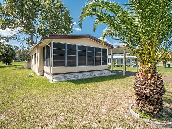 FURNISHED & well-maintained GOLF COURSE HOME SITS BESIDE THE #13 GREEN! It it includes a GOLF CART. This home features and UPDATED KITCHEN with WOOD CABINETS and newer appliances, DOUBLE PANE INSULATED WINDOWS, ceramic title and laminate floors, a large, vinyl enclosed Florida room and a screened patio under the carport. Metal roofover. New A/C 2010. Located in popular 55+ community where you OWN YOUR OWN LAND! Community amenities include tennis, heated pool, horseshoes, bocce, community center, pickle ball and more.