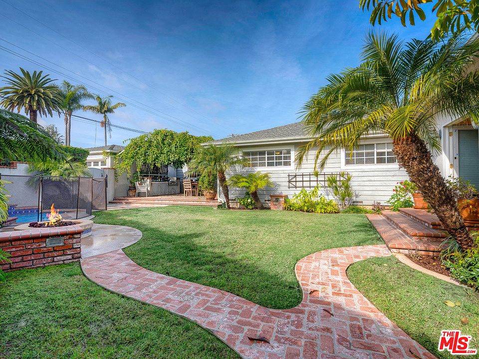 This modern Silicon Beach ranch house blends striking sophistication with timeless elegance. Stately curb appeal leads you inside to a picturesque living room with a stylish recessed ceiling, gas fireplace, and impressive lighting design. Continue to the open dining room and chef's kitchen boasting stainless steel appliances and a breakfast bar. Charming design detail such as decorative tile, skylights, exposed beam ceilings, elegant stained glass windows, and rich wood flooring abound in the common areas. The master suite is a sanctuary with its generous size, seating area, large bay window, and french doors leading to the backyard. Discover ultimate tranquility and privacy in the backyard, which features lush landscaping, a fire pit, a private patio, and trellised dining area with a built-in barbeque and prep sink/counter. Three well-appointed bedrooms, two bathrooms complete this family-friendly floorplan in the heart of Silicon Beach.