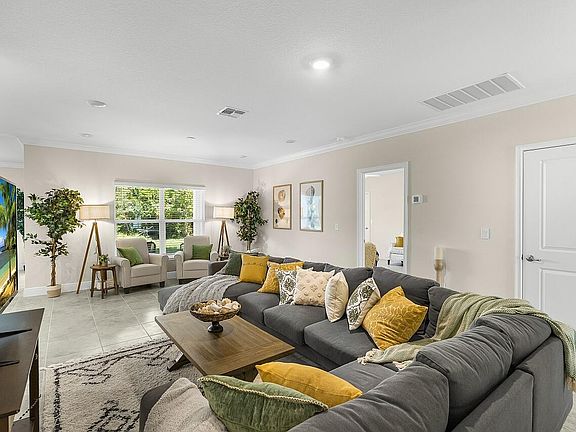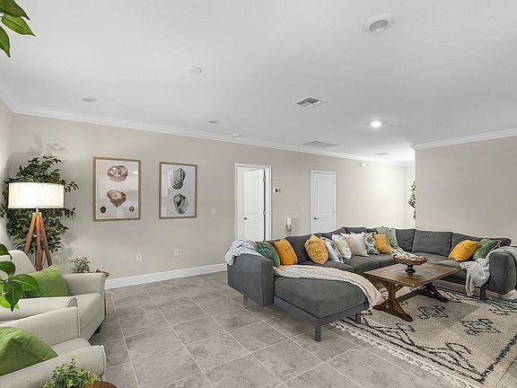 Primary suite offers huge walk-in closet w/ wire shelves. Dual Sinks and glamorous walk in shower w/ rain-head and Sep handheld w/bench! Private water closet w/door. Windows are already furnished w/ wood blinds. Laundry Room has additional storage w/ cabinets and more crown molding. Folding laundry area offers even more storage & organization! Lastly, enjoy the covered porch and extra-large flat backyard perfect for a new pool, pets, or outdoor living. Professionally landscaped and other mature landscaping preserved. Banana Trees here to stay!