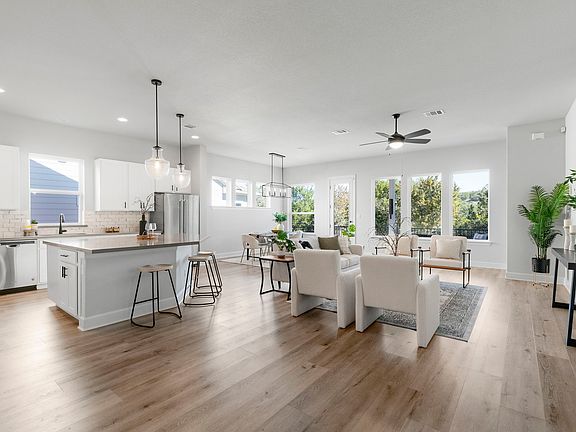 Features 11' ceilings, wide plank LVT floors, remote-controlled shades in primary, and a light-filled opening layout. The gourmet kitchen boasts a large island, stainless steel appliances, and a bright dining area flowing into the open living space. The primary suite offers greenbelt views, a soaking tub, double vanities, a walk-in shower, and a custom walk-in closet.