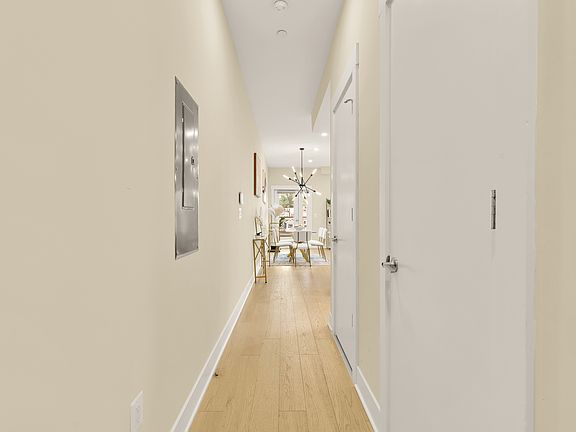 Head upstairs to find a sizable junior bedroom, a large full bathroom with shower/tub combo, a stacked washer and dryer, and a hallway that leads out to an impressive rooftop terrace. The impressive primary suite gets plenty of natural light through a massive window and glass door that also leads out to the rooftop terrace. The suite also includes an ensuite bathroom with a glass walled shower.