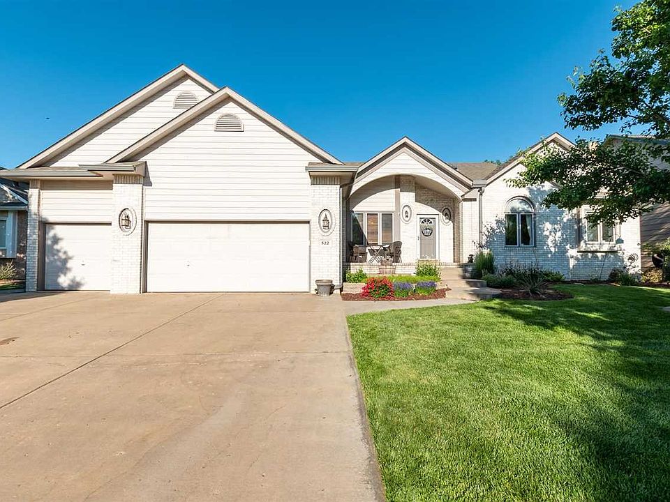 Spacious ranch style home in Goddard Eisenhower district with 3336 sqft total living space. Main floor features open floor plan with wood look tile floors throughout entry, dining room, kitchen and laundry. Huge 5x12 main floor laundry with raised platform for front load w/d that could be removed if needed. Large kitchen features a kitchen nook, large island, desk, pantry, new vented range hood and ample cabinet space. Interior also includes 10 ft. ceilings, 2 gas fireplaces, skylight in main floor hall bath, large master suite has an en-suite bath with double sinks, walk-in closet, whirlpool tub and separate shower. Walk-out basement features a huge family room, 2 guest rooms, remodeled 3rd bath and a large office with a closet that is currently being used as a non-conforming 6th bedroom. 3 car garage is fully insulated and sheet rocked with 220 elec. and 2 garage door openers. Private backyard with no one behind is fully fenced, has gorgeous trees, new paved stone patio, covered deck and sprinkler system and irrigation well. Recent upgrades include 50 year roof and 6 inch guttering new in 2019. No specials and walking distance to St. Elizabeth Ann Seton school. Whiskey barrels with light poles and lights on patio do not stay.