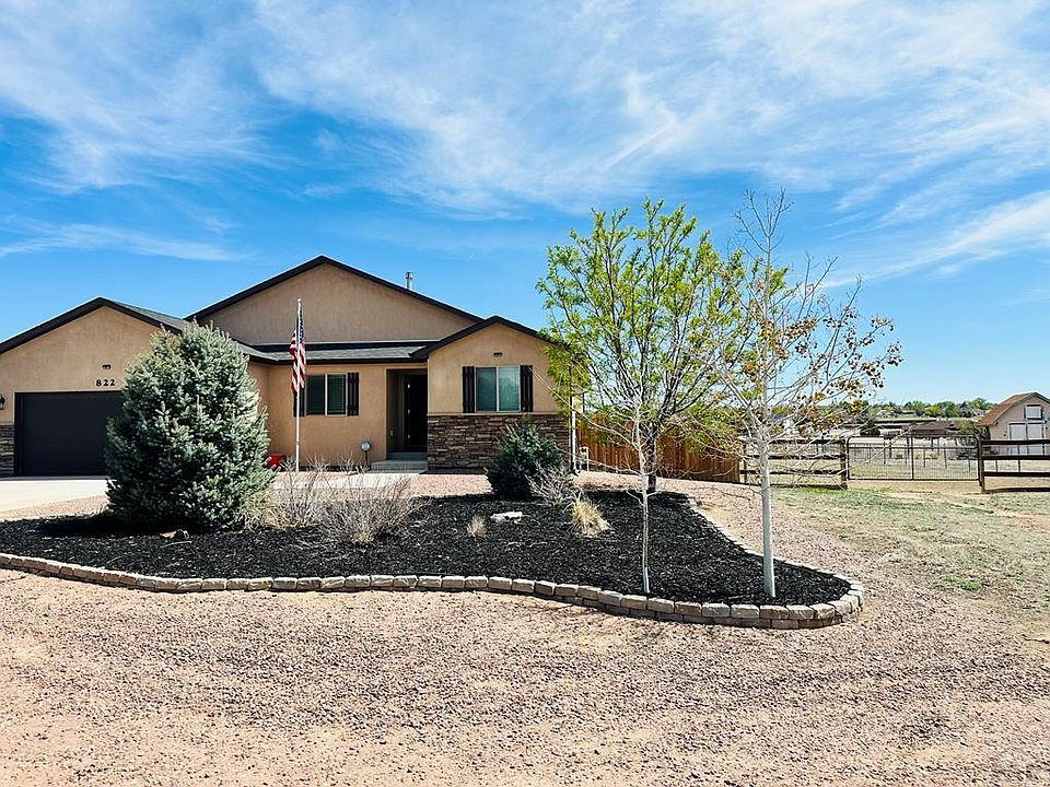 Improved Price on this stunning 5-bedroom, 3-bathroom home offers modern farmhouse style and comfort. The main level features an open concept living arrangement, centered around the gourmet kitchen with a large quartz island, perfect for hosting gatherings. The primary suite boasts a walk-in closet and a luxurious 5-piece bath with a walk-in shower and soaking tub. Two additional bedrooms and a full bath are also located on the main floor. The desired main level laundry/mud room is conveniently situated just off the kitchen and garage. The fully finished basement provides even more living space, with a large family room, two bedrooms, a full bath, and additional storage area. Step outside to the 10x14 deck, perfect for outdoor activities and entertaining, all enclosed with a privacy fence. Highlights include a 3-car attached tandem garage, a 10x12 Tuff Shed, a chicken coop, a gazebo, three raised garden beds connected to a sprinkler system, and four horse pens. This home sits on 1.45 acres, allowing space to build a barn/shop or park your RV and other recreational vehicles conveniently at your own house, avoiding storage fees. The location backs up to Pueblo West Green Space, walking/biking/equestrian trails, Pueblo West High School, and Lake Pueblo. Zoned A-3 for horses, this property offers quick access to area amenities and an easy 45-minute commute to Fort Carson and Colorado Springs Airport.