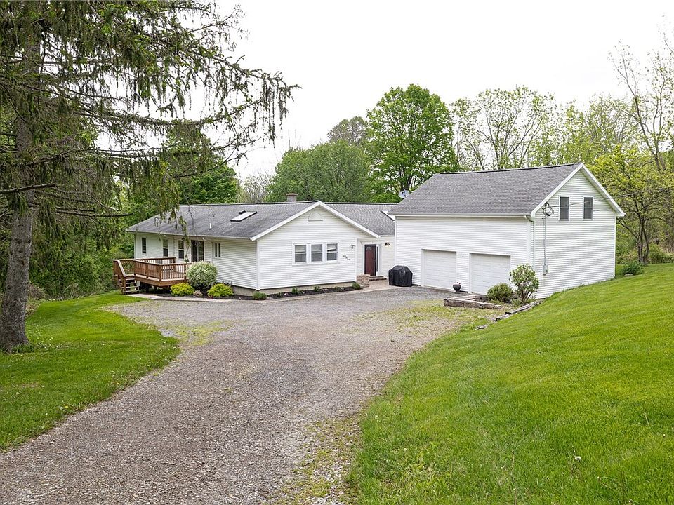 Unforgettable-that's what 8220 Simmons Rd is! This stunning ranch features 3 bdrms, 3 full baths, a 2-story 2.5 car garage on 5+ acres (horses are permitted)! You'll love the open concept eat-in kitchen, breakfast bar & slider to the well-appointed deck--great for entertaining or a romantic dinner for two! The generous Great rm offers cathedral ceiling, gorgeous hardwoods, warming skylights & slider to the park-like yard! The primary suite boasts a large walk-in closet, private bath & slider to expansive back deck! What a view to wake up to...grab your java & enjoy all nature has to offer right from own suite. Benefit from the numerous updates: newer flooring, carpeting, fresh paint, remodeled bath, water softener & filtration system, cabinets in 1st flr laundry rm, hot water tank, oil tank & shed! Enjoy the cost effective, secondary heat sources in the Great room and Lower Level. The partially finished lower level walkout adds 1000+ sqft of living space & features a wet bar, office & full bath! This home awaits a new owner to continue to love all that it has to offer. Call today to see this very special offering!