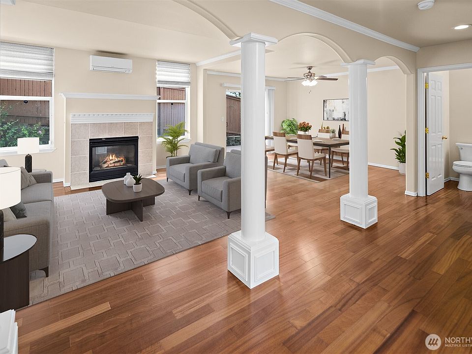 Mukilteo's Finest ~ Live like you're in a two-story home in this spacious 2 bdrm END-UNIT condo in the beautiful gated community of Possession Ridge! 1,521 sqft, fresh interior paint, stunning hardwood floors & custom millwork throughout. The open-concept great room is perfect for entertaining, complemented by a kitchen featuring a brand new SS refrigerator & 2022 SS stove & dishwasher. Upstairs loft area is perfect for WFH. Use your green thumb in the back garden area or relax on your private deck. Comfort meets convenience with 2023 mini-split A/C, radiant in-floor gas heating & a huge walk-in closet in the primary suite. Easy level entry & elevator access from the secure garage w/2 pkg spaces & storage closet ~ this one truly has it all!