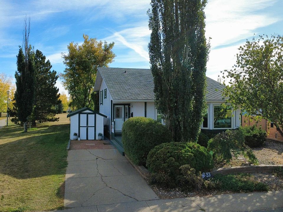 Beautiful home boasting 2,100 sqft of total living space, uniquely located on the edge of a park with no boundary fences, and only one neighbour to the south. 5 bedrooms. 2 bathrooms, one 4 piece, one 3 piece. 4-level split built in 1984. Vaulted ceilings. Aluminum siding. Renovated in 2018 and 2007. Vinyl plank flooring on three levels (installed 2019), carpet on bottom level. Three storage sheds. No garage. Low maintenance beautifully landscaped and mature trees (no lawn). Near a playground, school, LRT line for the west being built. 50 meter walk to bus route. Washer, dryer, fridge, stove and dishwasher and central air conditioning. Also included 6 person hot tub in a covered gazebo (included)