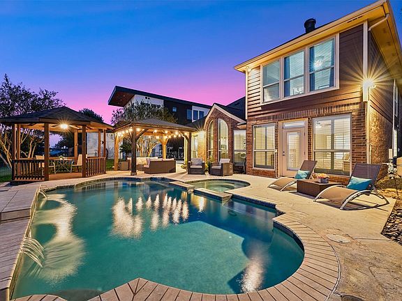 The gourmet island kitchen features gleaming granite counters, a stylish mosaic backsplash, 5-burner gas cooktop, & an oversized breakfast bar—perfect for gathering. Relax in the luxe master suite offering a generous walk-in closet, dual vessel sinks, a farmhouse tub, & a frameless glass shower. Step outside to your backyard retreat with a sparkling pool & spa, shady gazebo, majestic palm trees, & private boat dock with jet-ski lift. With top shopping & dining at Atascocita Commons only minutes away, this home is the ultimate lakeside escape!