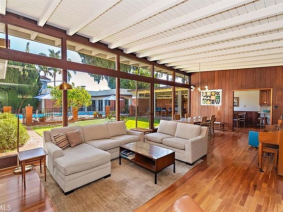 Welcome to this Classic Mid-Century Modern home with (2) dwellings on one property. The 1-bed Guest House offers income opportunity or extra room for extended family. This amazing home has 4 bedrooms and 3 baths, with 2,538 sq. ft. of living area, all on a huge 13,692 sq. ft. lot. California living at its best with the spacious backyard, oversized pool and barbeque area make it truly an entertainer’s delight. Features include an open living room with 12' high beamed ceilings, a full wall of windows looking out onto your large private backyard, covered patio, brick barbecue area and a massive pool. The beautiful wood tones are throughout the home with paneling and hardwood flooring. Plenty of storage in the kitchen with a walk-in pantry, built in desk area, and cabinetry. The private 4th bedroom and bath is on the other side of the house, offering privacy for guests, teens or an office. The 1 bed/ 1 bath guest house is approx. 800+ sq. ft. and includes a kitchenette and fireplace. This home sits on a quiet, private road and is perfect for added income or multi-generational living. Don't miss this opportunity!