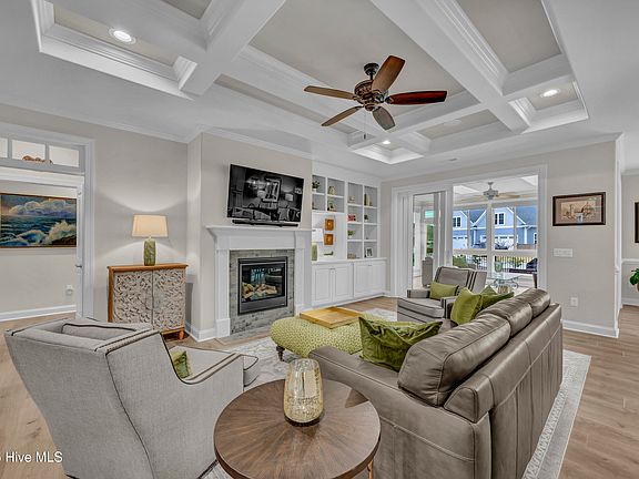 Discover low-maintenance living in this Collington Towns duplex that blends charm and coastal flair. Located in the highly sought-after community of Brunswick Forest, this property offers exceptional comfort, custom upgrades, and access to world-class, resort-style amenities. Step inside to an inviting open layout featuring 7'' hardwood floors, crown molding, and a stunning coffered ceiling in the living room. A natural gas fireplace with brick surround and a built-in bookshelf adds warmth and architectural charm. The chef's kitchen is ideal for entertaining, showcasing raised cabinetry, quartz countertops, subway tile, a natural gas range, and thoughtful custom lighting. Wood shelving throughout the home adds both style and functionality. Retreat to the finished sunroom, complete with telescoping doors, screens, and UV-protected windows, offering year-round enjoyment. The primary suite features a tray ceiling and a beautifully designed bath with quartz counters and raised vanities. Additional highlights include a whole-home dehumidifier, a fenced backyard with patio, conditioned storage, a utility sink in the garage, and a generous attic storage area. Located in an amenity-rich community offering a fitness center, tennis and pickleball courts, three pools, kayaking opportunities, and the renowned Cape Fear National Golf Course, this home is the perfect blend of comfort, convenience, and coastal lifestyle.