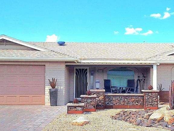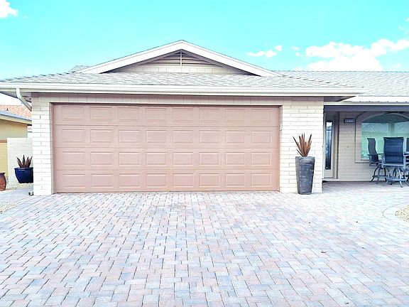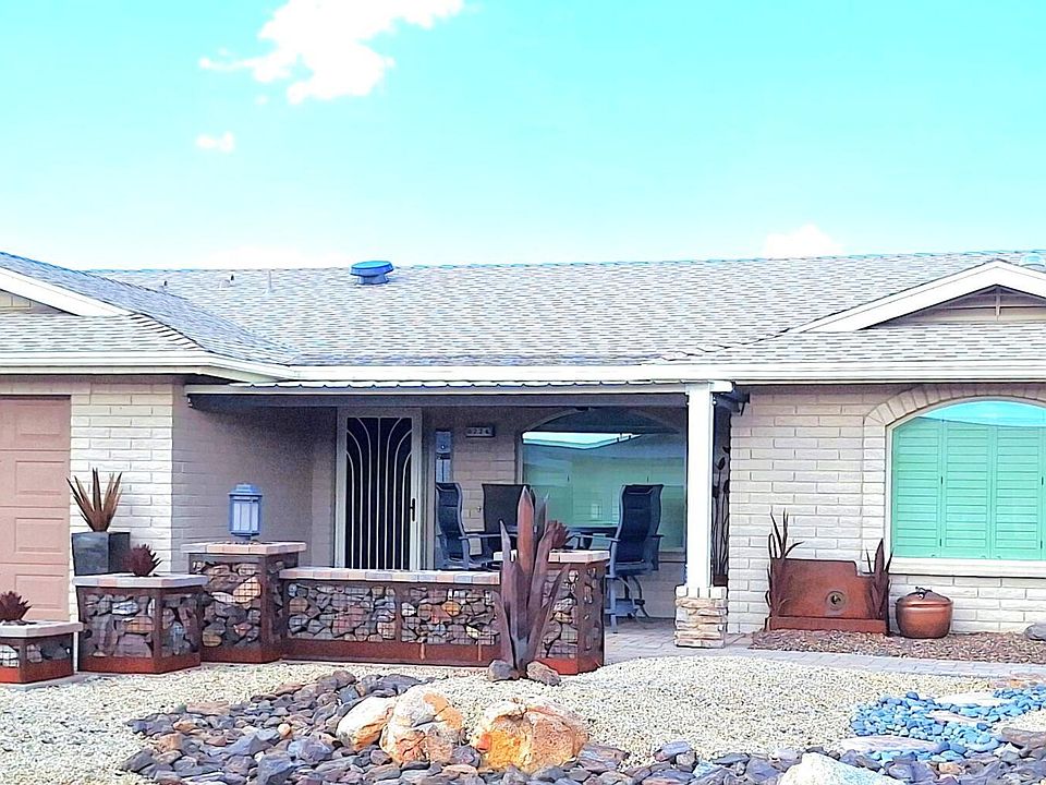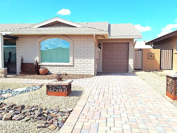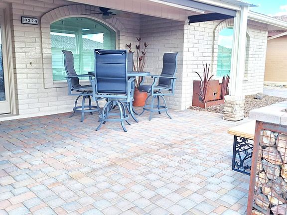 This beautifully upgraded home offers designer touches from front to back.  A paver driveway and patios enhance the curb appeal and extend into the backyard, creating seamless indoor-outdoor living. Inside, the open floor plan features vaulted ceilings connecting the living, dining, kitchen, and family areas. The kitchen shines with raised panel white cabinets, crown molding, granite countertops, breakfast bar, stainless steel appliances, a tiled backsplash, and a custom coffee nook. Diagonal 18'' tile runs throughout, and a separate office add flexibility. The spacious primary suite includes an upgraded bath with an oversized glass shower, while the guest bath offers granite counter tops and a beautifully tiled shower. The laundry room provides ample storage with white cabinets, granite counters, and a sink. Designer lighting, faucets, and ceiling fans complement the plantation shutters and upgraded windows, roof, A/C and heating system. The garage and patio feature epoxy flooring, and the backyard is perfect for entertaining with its paver patio, large pergola with sunshades, and a golf cart/storage garage. This home is move-in ready and truly stunning inside and out.