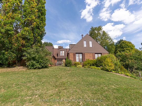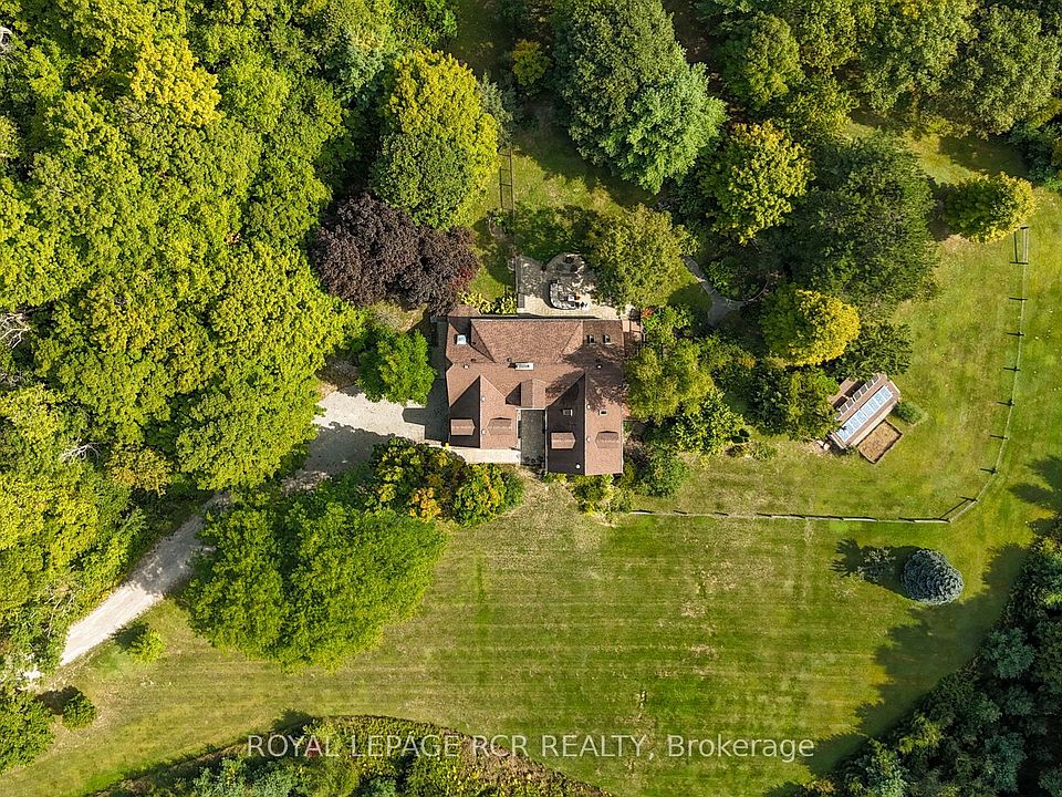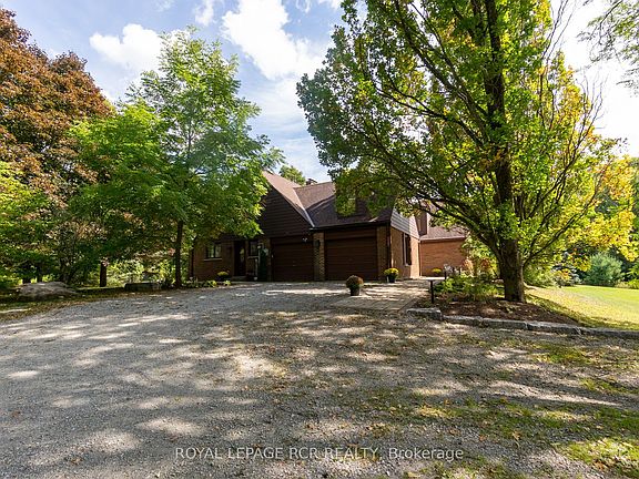 Discover unparalleled peace and endless potential on this breathtaking 10-acre retreat, nestled among majestic mature trees offering total privacy. Tucked away from the everyday, yet just minutes from town amenities, this idyllic woodland haven blends serene seclusion with day-to-day convenience perfect for those seeking a versatile lifestyle in natures embrace. A long, winding driveway welcomes you with a true sense of arrival, leading to a one-of-a-kind custom-built home, thoughtfully positioned to take full advantage of the natural surroundings. Step into the inviting front foyer and into the main level, where hardwood floors run throughout and warm, welcoming spaces await. The open-concept living room features a cozy fireplace, while the expansive family room impresses with a stunning stone fireplace, soaring open-to-above ceilings, and walk-outs to both the backyard patio and spacious deck ideal for relaxing or entertaining. The heart of the home is a bright, cheerful eat-in kitchen, where large windows frame lovely views of the property. A convenient mudroom offers direct access to the attached two-car garage. The main level also includes a generously sized bedroom with 3-piece ensuite, a second bedroom, and a full 4-piece bathroom. Upstairs, a striking architectural design greets you in the loft and study area, where skylights and large windows bathe the space in natural light. The upper level also features a spacious primary suite with fireplace, 3-piece ensuite, and ample closet space, along with a large skylit laundry room.The partially finished lower level offers incredible potential for multi-generational living or growing families. It includes a large recreation room with walk-out, a 3-piece bath with sauna, a second recreation room with fireplace, wet bar, and another walk-out to the yard. Whether you dream of expanding, relaxing, or simply enjoying the quiet beauty of Caledon, this private sanctuary is ready to welcome you home.